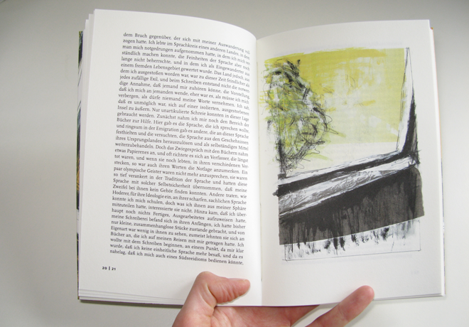 Peter Weiss nutzte das Schreiben als Kunstform und Ausdrucksform, um sich selbst näher zu kommen, um sich »auf dem Papier zu entladen«. In dem Roman »Fluchtpunkt« werden Kapitel nur durch Absätze markiert, die Anführungszeichen in der wörtlichen Rede entfallen genauso wie Frage- und Ausrufungszeichen. Der Text ist hintereinander weg geschrieben und holt nur in Absätzen Luft. Daher bekamen die Absätze von mir ein zusätzliches Element um die Orientierung zu erleichtern. In den Illustrationen versuche ich diese für Peter Weiss so wichtige »Entladung auf dem Papier« zu verdeutlichen. Die in dem Roman thematisierte Identitätssuche zeigt sich in den collagenartig, flüchtig und suchend auf das Papier gebrachten Zeichnungen, die nur punktuell in Aquarell und Acryl ausgearbeitet sind. |