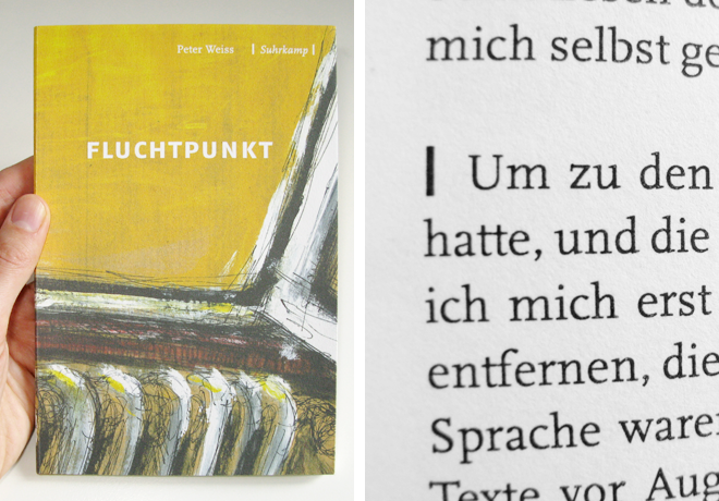 The autobiographic colored novel »Vanishing Point« by Peter Weiß was the basic for this fee project. Peter Weiß used his writing as an art and form of expression to converge him self and to »explode on the paper«. In the novel »Vanishing Point« the chapters were marked only by a break, the double quotes as well as the question- and exclamation marks failed. The text wrote of the reel and without snapping air. There for I marked the breakes with an extra element to lighten the orientation through the text. |