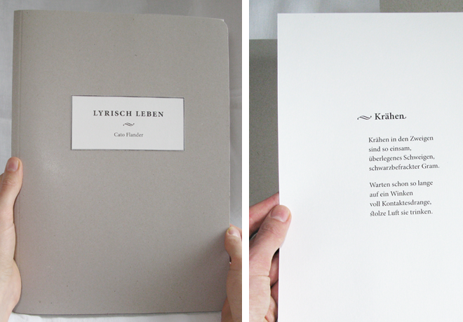 Diese Mappe mit Gedichten des Dichters Cato Flander habe ich so konzipiert, dass jedes Gedicht lose in der Mappe liegt. Dadurch kann jedes Gedicht einzeln, beispielsweise auf einem Notenständer, »ausgestellt« werden. | I designed this folder for the lyric poems of Cato Flander. Each poem is on one loose sheet of paper. Thereby it's possible to display each poem seperately. | |