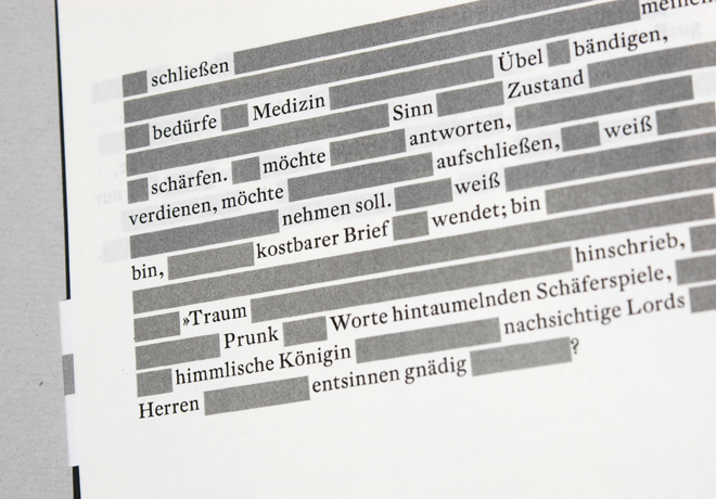 Anhand des Textes »Ein Brief« von Hugo von Hofmannsthal habe ich mich mit dem Begriff der Ruine in der Schrift und der Typografie beschäftigt. Der fiktive Brief, den Hugo von Hofmannsthal, zu beginn des 20. Jh. verfasst, spiegelt die Angst vor dem Zerfall von Sprache wider. Diesen Zerfall visualisiere ich durch das Verdecken von allen Substantiven, Verben und Adjektiven in ihrer reinen Form. Die Umkehrung ist jeweils auf der rechten Seite sichtbar. |